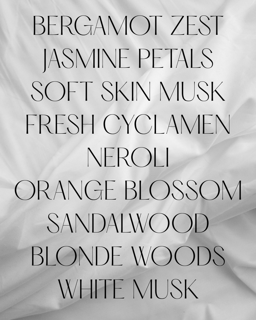 Notes: bergamot zest, jasmine petals, soft skin musk, fresh cyclamen, neroli, orange blossom, australian sandalwood, blonde woods, white musk